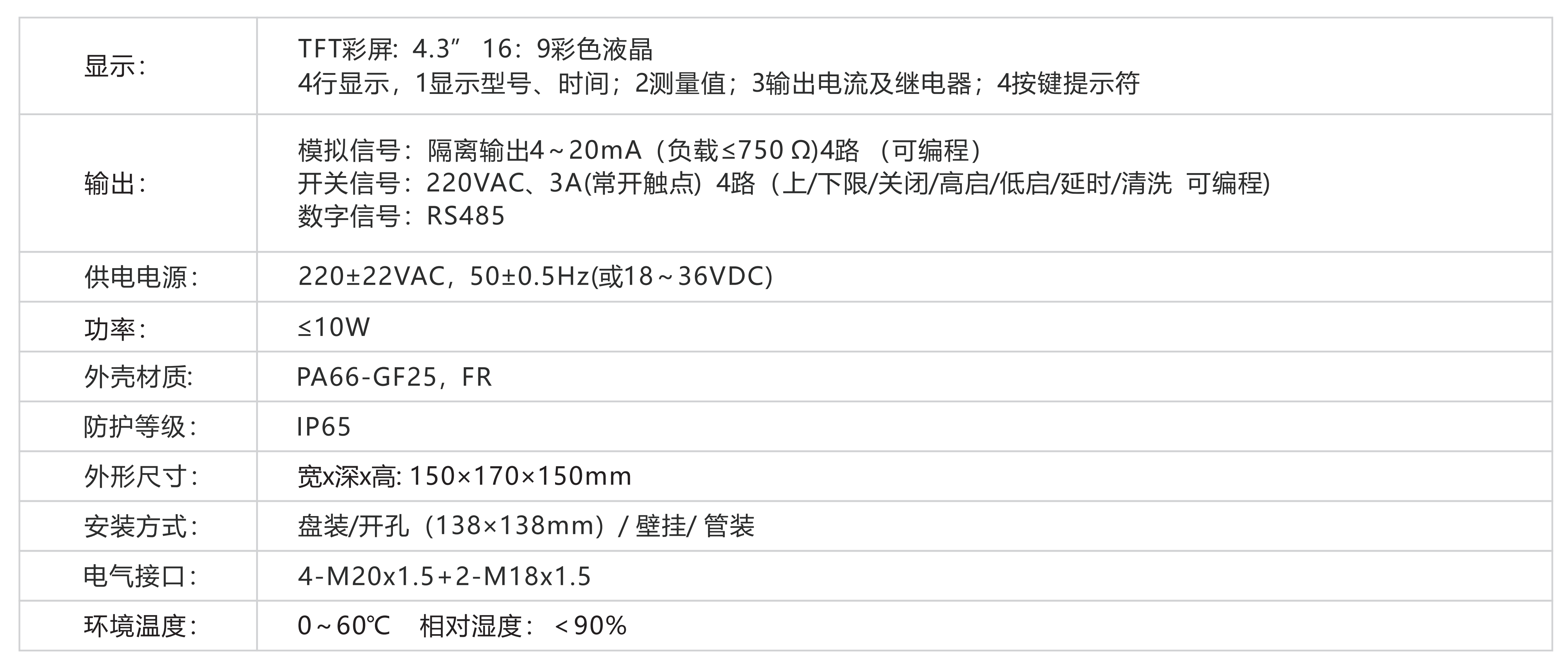 可編程繼電器輸出:繼電器報(bào)警值/回差控制/清洗控制等可編程