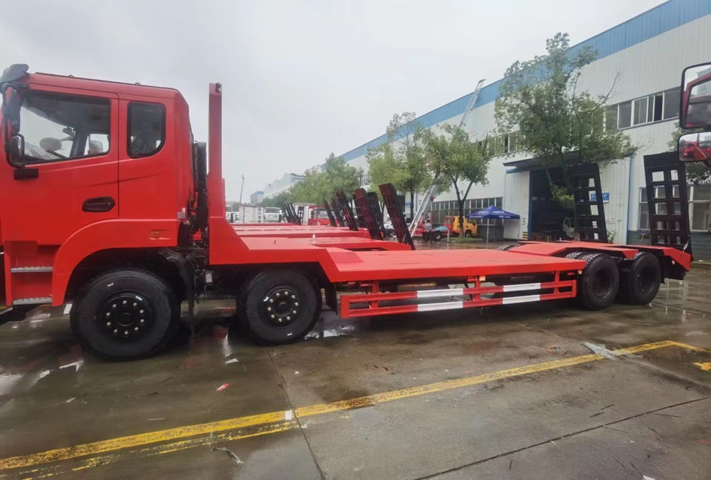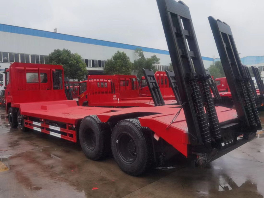 整車配置: | 底盤配置:齊星20S四點懸浮豪華版,玉柴350馬力,法士特10檔變速箱,1700+5800+1350軸距,前后橋5.5噸/13噸,輪胎11.00R20鋼絲胎。 上裝配置:下沉部分4.7米,寬度2.55米,方筒145*120套120*100的8個厚的錳鋼,下沉部分離地高度90公分,面板采用8mm厚花紋板或10mm、12mm平板,加密斜支撐,板面鋪設防滑鋼條,車尾雙彈簧加強型爬梯【三道筋】,便于工程車上下安全,斜坡下有后支腿,選裝平板板面【液壓或手動】伸縮加寬、選裝【液壓或手動】折疊爬梯;該車有國家環保公告和燃油公告,可在全國各地上牌、辦理營運證。 | ||
