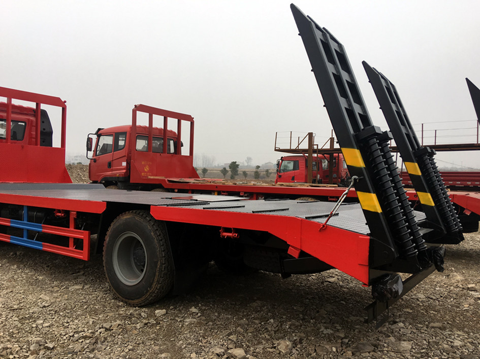 上裝配置:平板板面與輪胎平齊,大梁外包10MM厚平板,橫梁采用120*120方管(5mm或8mm),橫梁間距25公分,面板采用8mm厚花紋板或10mm、12mm平板,加密斜支撐,板面鋪設防滑鋼條,加強型雙彈簧爬梯(三道筋),斜坡下方后支腿,平板板面可伸縮至3.2米,選裝平板(液壓或手動)伸縮加寬、選裝液壓或手動)折疊爬梯。