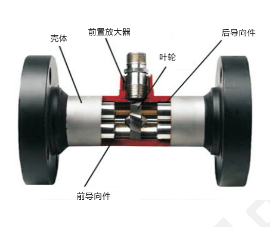 渦輪流量計的工作原理如下圖所示,當(dāng)被測流體流過傳感器時,在流體作用下,葉輪受力旋轉(zhuǎn),其轉(zhuǎn)速與管道平均流速成正比,葉輪的轉(zhuǎn)動周期地改變磁電轉(zhuǎn)換器的磁阻值。檢測線圈中的磁通隨之發(fā)生周期性變化,產(chǎn)生周期性的感應(yīng)電勢,即電脈沖信號,經(jīng)過放大調(diào)制后,輸出標(biāo)準(zhǔn)信號。