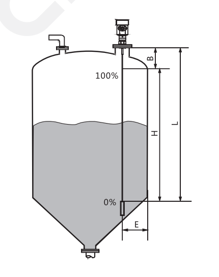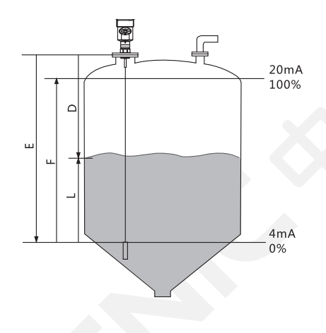 通過輸入空罐高度E(=零點),滿罐高度F(=滿量程)及一些應用參數(shù)來設定,應用參數(shù)將自動使儀表適應測量環(huán)境,對應于4~20mA輸出。