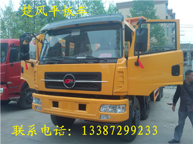 楚風前四后八平板車,防天錦駕駛室,濰柴300馬力國四發動機,153后橋,10.00R20鋼絲輪胎,陜齒十檔變速箱,平板板面為國標8mm厚花紋板,120×120mm方管,平板液壓伸縮3.2米,斜坡手動伸縮3.2米,折疊爬梯5米兩節全液壓,帶淋水器,空調(該車尺寸和配置可自選)聯系電話:18771356680顏經理13387299233
