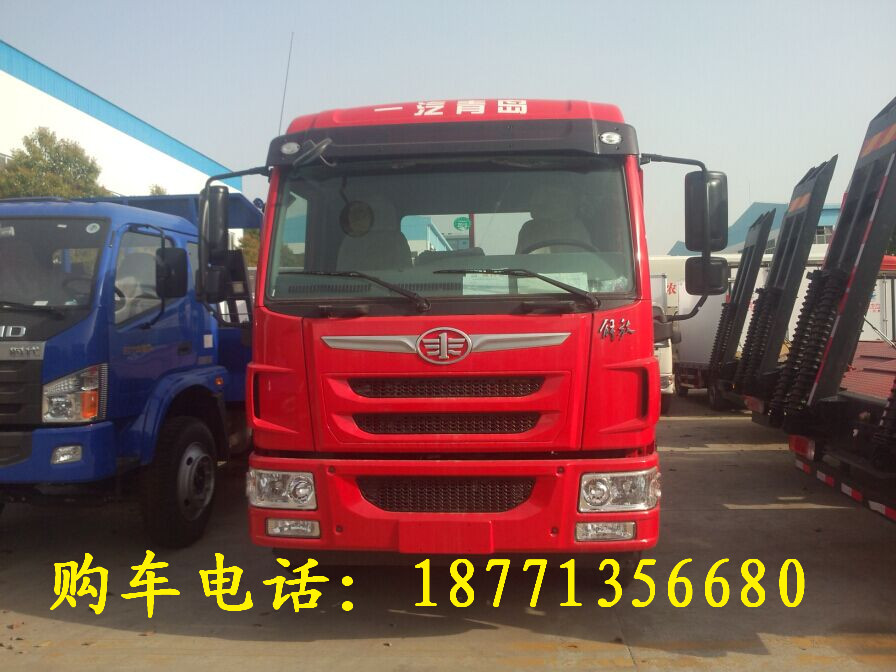 采用解放龍V底盤:大柴160馬力國四發動機,一汽六檔變速箱,9.00R20輪胎,232大梁,9噸后橋,平板板面為6mm厚優質武鋼花紋板,底部方管為100×100mm,方管厚度6mm,外形尺寸:9000×2500×2900,平板尺寸:6500×2500×1150(mm),該車有國家環保公告和燃油公告,可在全國各地上牌辦理營運證。