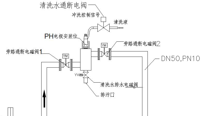 3.清洗過程結(jié)束,通過控制電路開啟旁路通斷電磁閥1和2,關(guān)閉清洗水通斷電磁閥和清洗水排水電磁閥,此時(shí)介質(zhì)正常從旁通管內(nèi)流通回到主工藝管路,繼續(xù)介質(zhì)的PH在線測量;