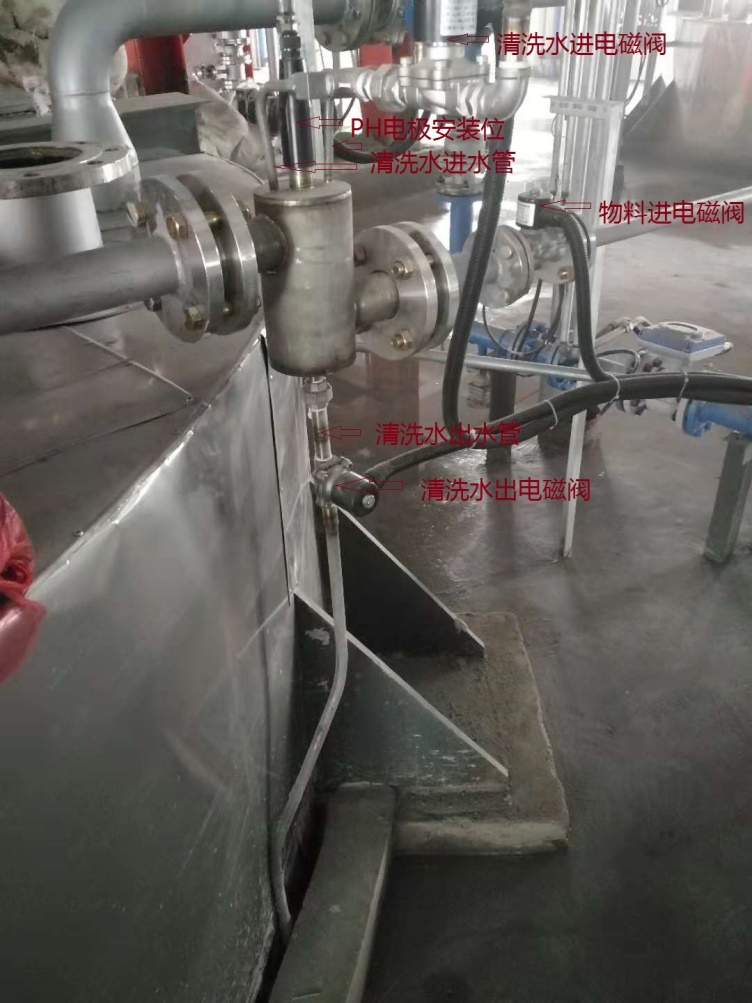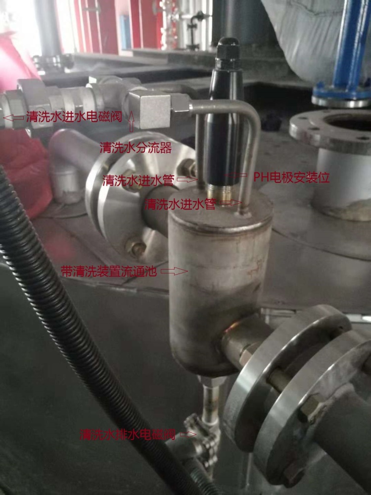 通過特別設(shè)計(jì)的流通池,在設(shè)定的時(shí)間利用沖洗泵抽取清水對PH傳感器進(jìn)行沖洗,沖洗過程中利用電磁閥控制物料管路和沖洗管路的關(guān)閉,這樣一方面既能保證測量的準(zhǔn)確度并減少傳感器的損耗,增長了傳感器的使用壽命,同時(shí)不會(huì)讓清洗水流入到物料內(nèi)。