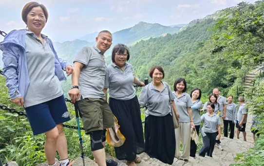 次日早晨,全體集合,一同前往美麗的天臺山風(fēng)景區(qū)爬山。隊(duì)伍沿著石階緩緩向上,待到登上頂峰,風(fēng)拂過臉頰,帶著山巔的清爽,遠(yuǎn)處的云海翻涌著與天際相接,腳下的群峰在晨光里若隱若現(xiàn)。這一刻,所有的汗水都成為了最美好的回憶。